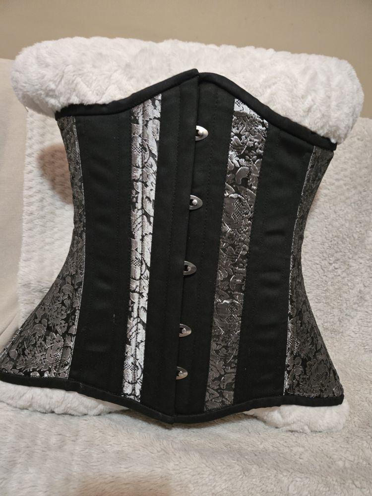 Elegant silver and black brocade corset designed for a 26-inch waist goal and 13-inch length. Perfect for waist training, posture support, or making a bold fashion statement.