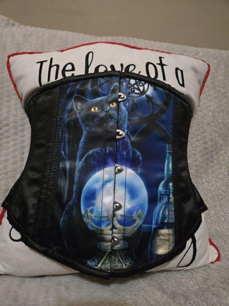 Mystical cat corset with crystal ball print. 26-inch waist goal, 11-inch length—perfect for whimsical, spooky style!